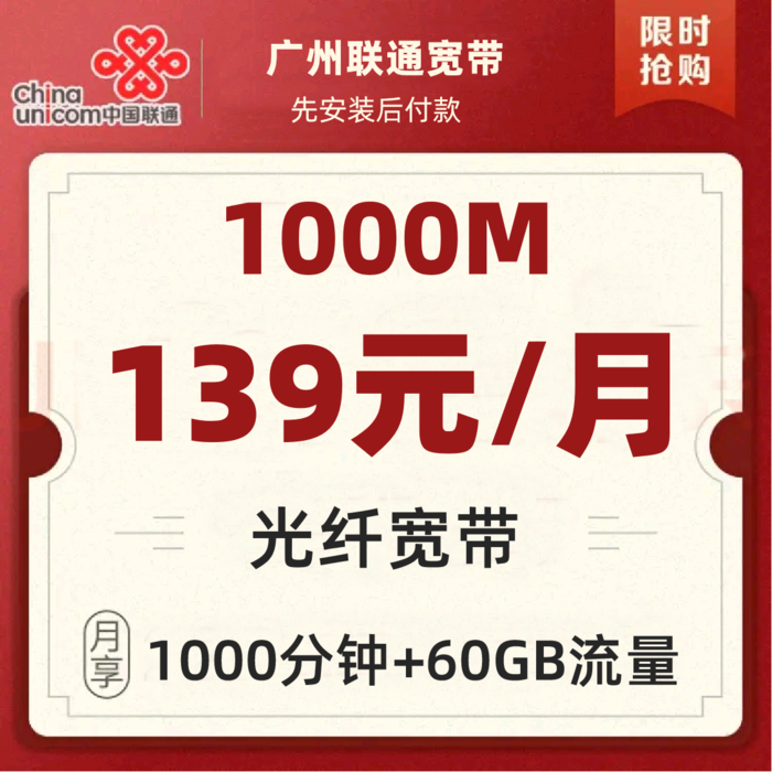 内容:139元每月,包含一条300m光纤宽带,送一张手机号,每月包含60G手机上网流量+1000分钟国内通话。